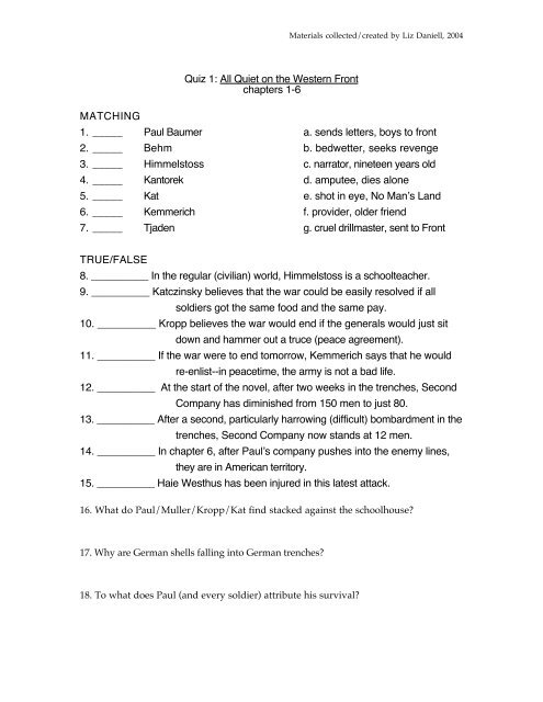 Quiz 1 All Quiet On The Western Front Chapters 1 6 Matching 1